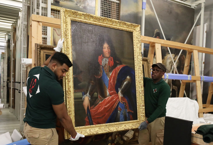2024年3月11日,在法国巴黎近郊的凡尔赛宫,工作人员准备打包油画《路易十四戎装像》。在2024年中法建交60周年暨中法文化旅游年之际,凡尔赛宫和故宫博物院将于4月至6月在故宫共同举办“凡尔赛宫与紫禁城”展览。凡尔赛宫工作人员将70余件法方展品打包装箱,计划在不久之后将其运往北京。新华社记者 高静 摄