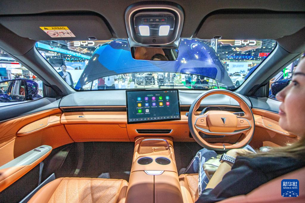 3月27日,一名观众在泰国曼谷国际车展上拍摄比亚迪海豹汽车。