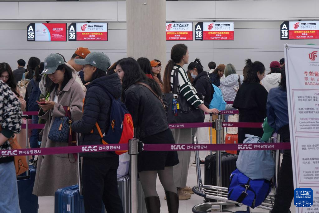 3月31日,在韩国济州国际机场,乘坐国航济州至北京航线班机的旅客办理值机。