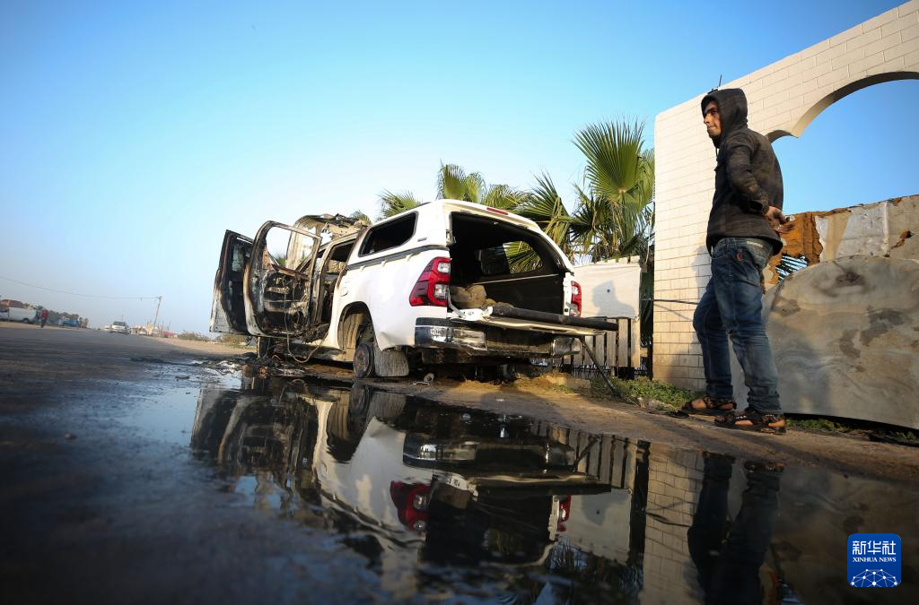 4月2日,在加沙地带中部代尔拜拉赫,巴勒斯坦人空袭过后路过被毁的汽车。