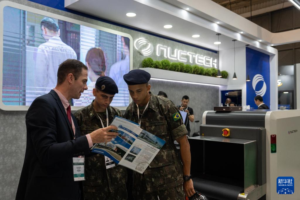 4月4日,在巴西圣保罗举行的巴西防务展上,参观者在行动者科技公司展台上与工作人员交流。