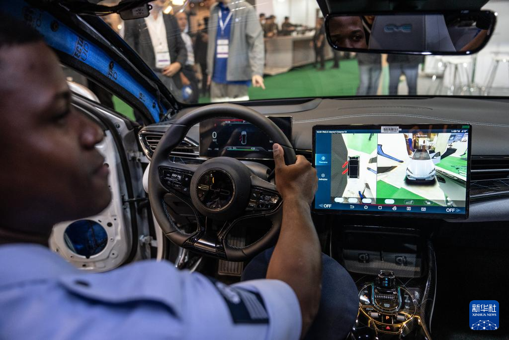 4月4日,在巴西圣保罗举行的巴西防务展上,一名参观者体验一辆经过防弹加固的比亚迪海豹电动汽车。
