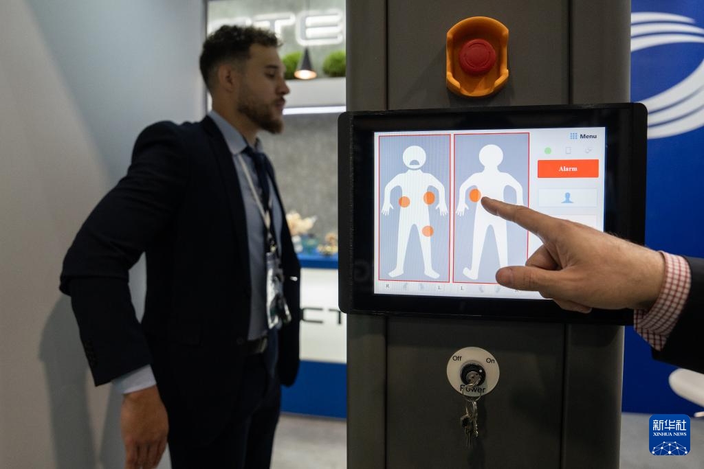 4月4日,在巴西圣保罗举行的巴西防务展上,一名工作人员演示一款同方威视的安防装备。