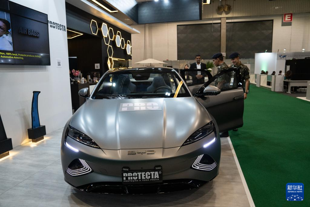 4月4日,在巴西圣保罗举行的巴西防务展上,参观者体验一辆经过防弹加固的比亚迪海豹电动汽车。
