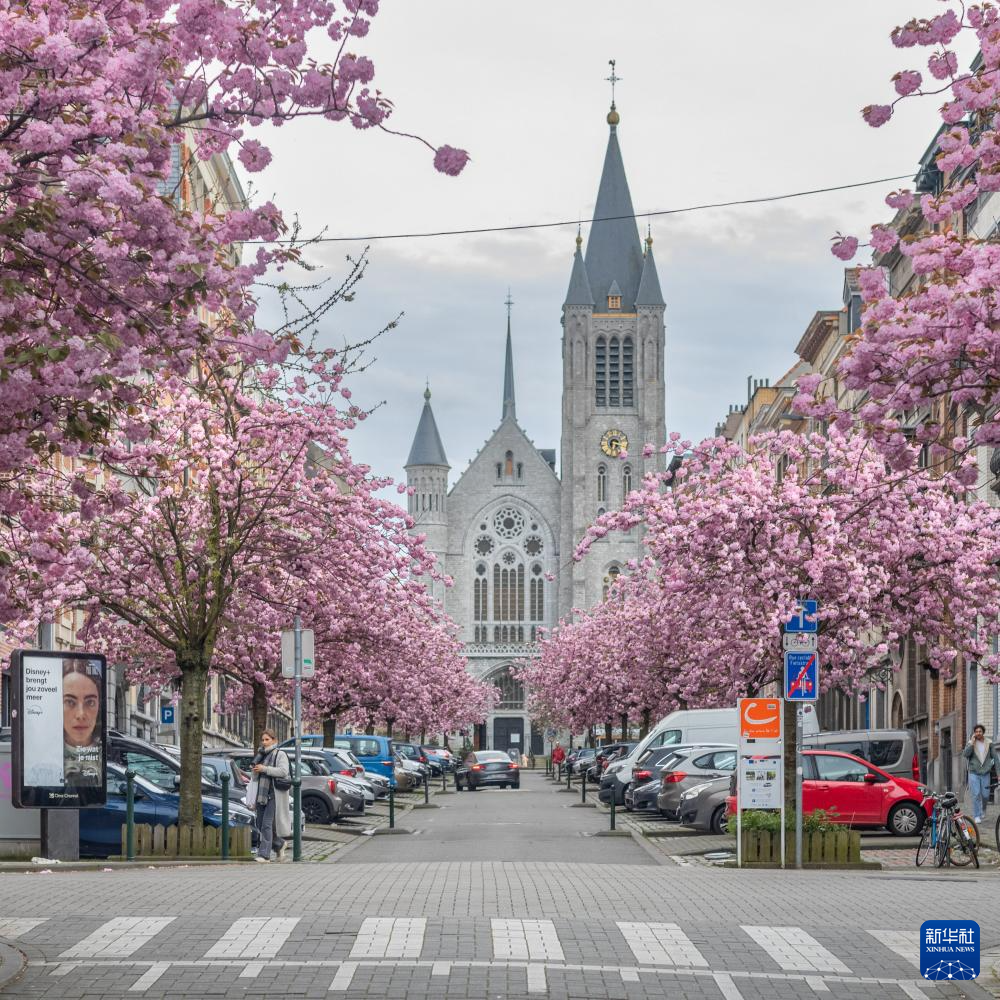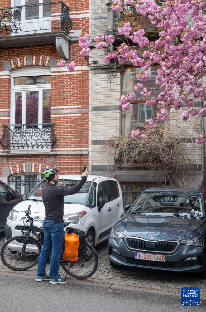 这是4月5日在比利时布鲁塞尔拍摄的盛开的樱花。
