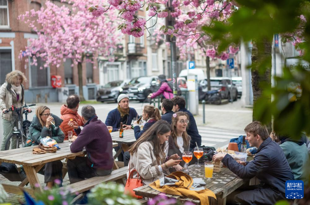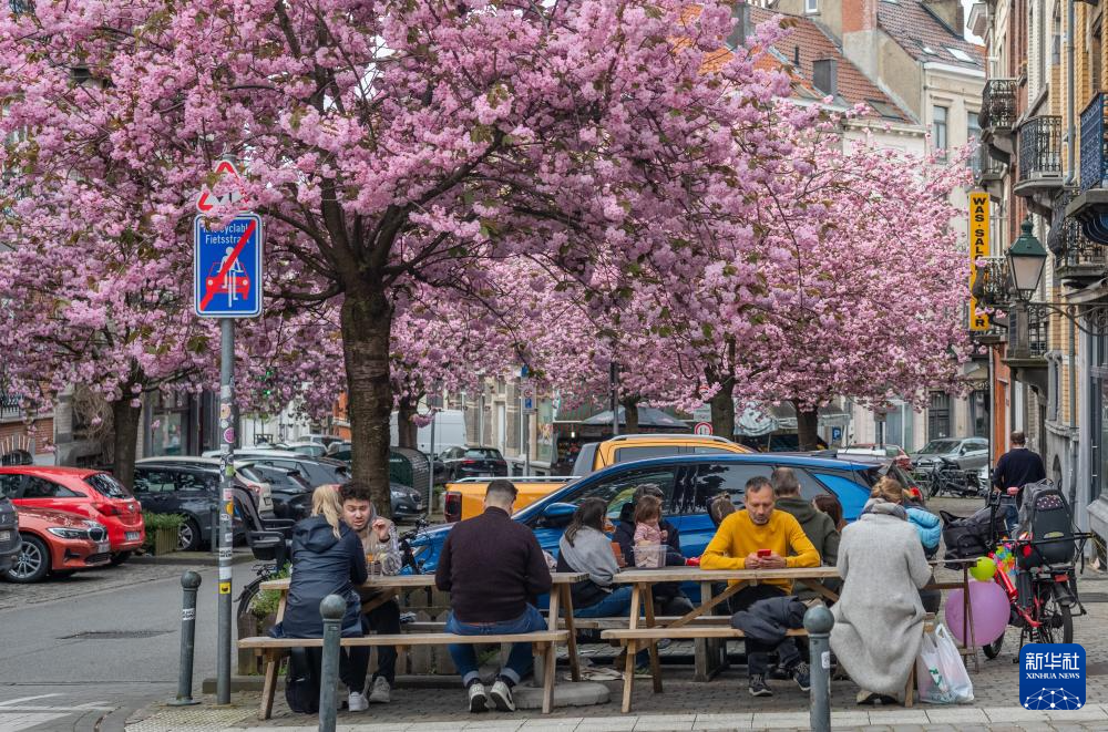 4月5日,在比利时布鲁塞尔,人们坐在盛开的樱花下。