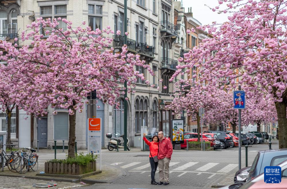 4月5日,人们在比利时布鲁塞尔一处樱花盛开的街道自拍。