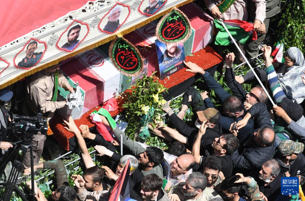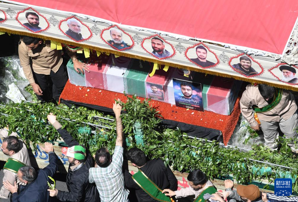 4月5日,在伊朗德黑兰,人们参加伊朗驻叙使馆遭袭事件中丧生的7名伊朗伊斯兰革命卫队成员的葬礼。