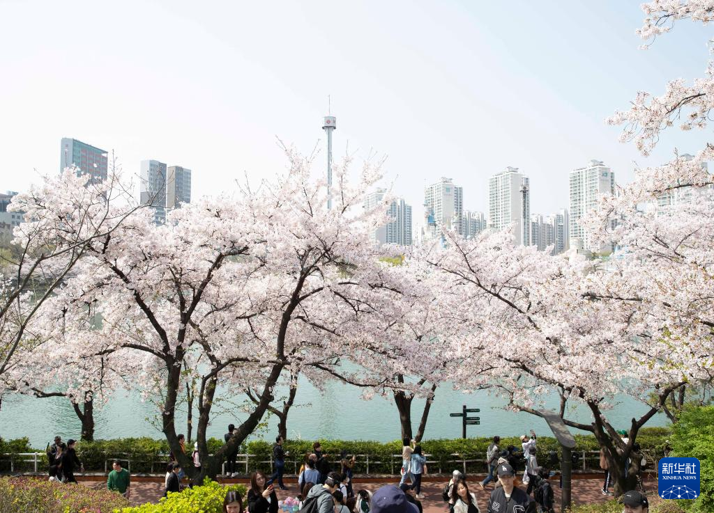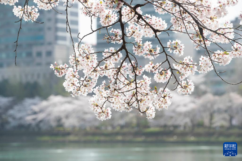 近日,韩国首尔天气转暖,樱花陆续开放。