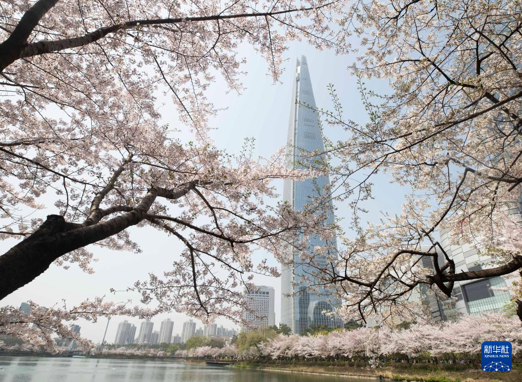 4月7日,韩国首尔石村湖附近的樱花绽放。