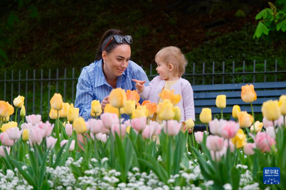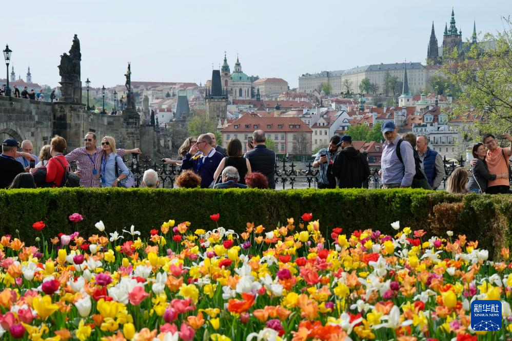 4月7日,在捷克首都布拉格,人们在盛开的郁金香旁游玩。新华社记者 邓耀敏 摄pagebreak