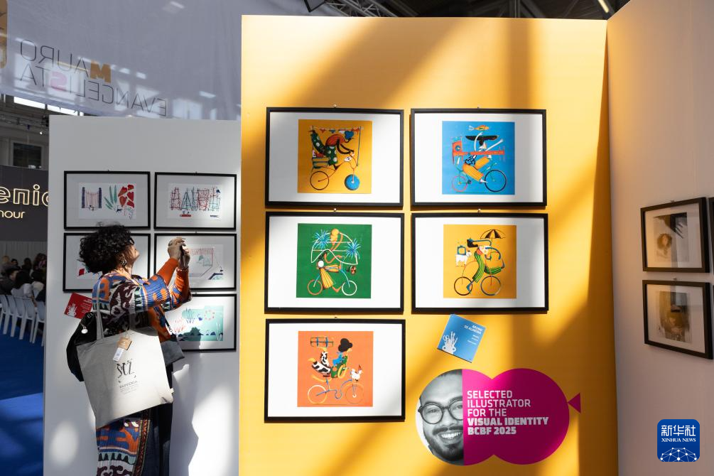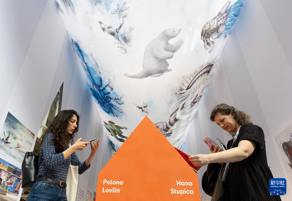 4月8日,在意大利博洛尼亚举行的第61届博洛尼亚国际童书展上,一名女子拍摄插画。