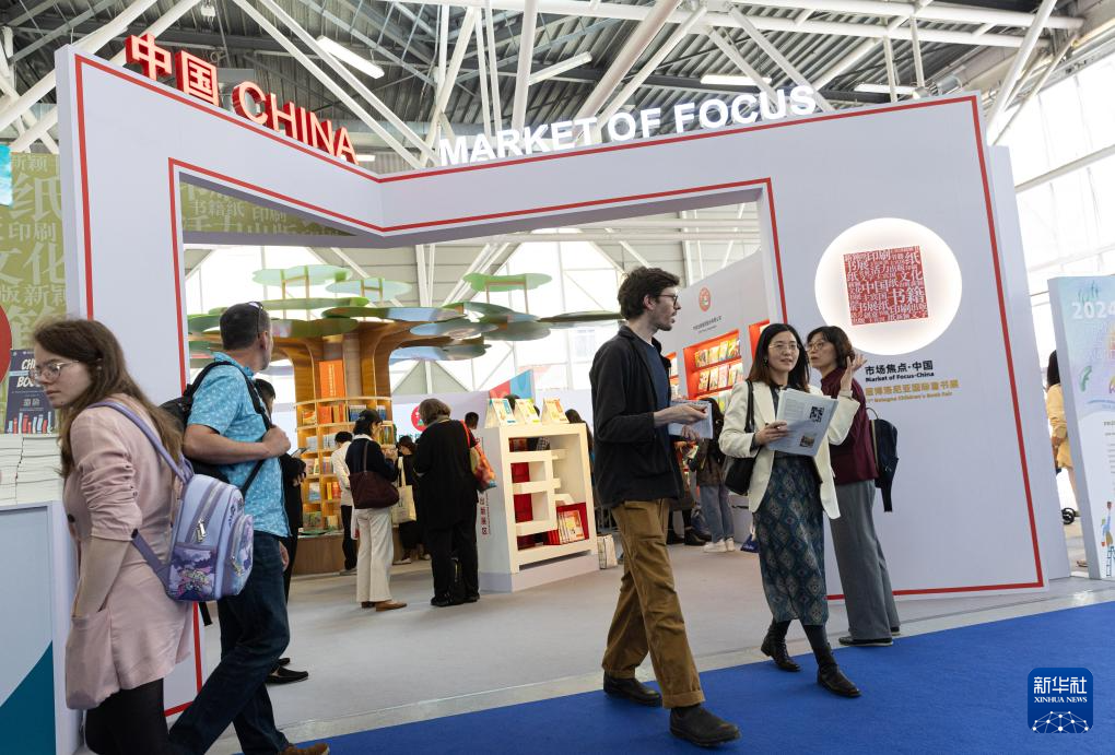 4月8日,在意大利博洛尼亚举行的第61届博洛尼亚国际童书展上,人们参观中国展区。