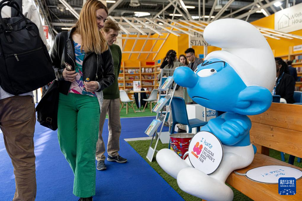 4月8日,在意大利博洛尼亚举行的第61届博洛尼亚国际童书展上,参观者观看“蓝精灵”玩偶。