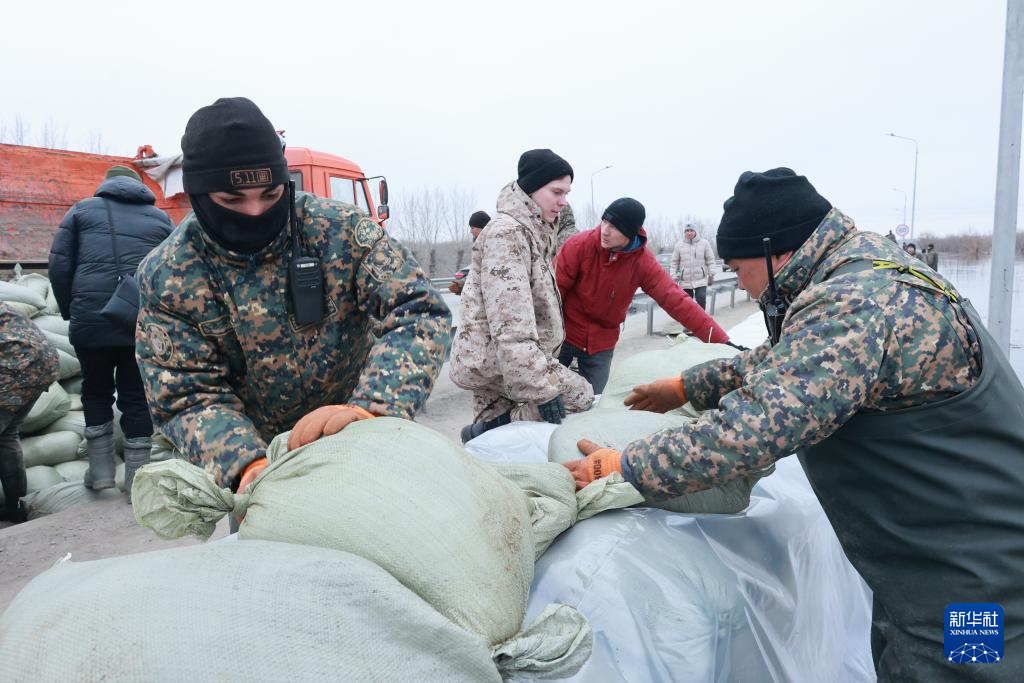 4月7日,在哈萨克斯坦科斯塔奈州,安全人员布设防洪堤坝。
