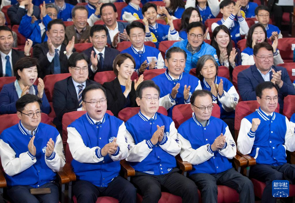 4月10日,在韩国首尔,韩国最大在野党共同民主党党首李在明(前排中)与共同民主党领导层共同庆祝出口民调结果大幅领先。