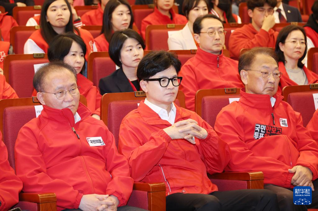4月10日,在韩国首尔,国民力量党领导人韩东勋(前排中)观看出口民调。