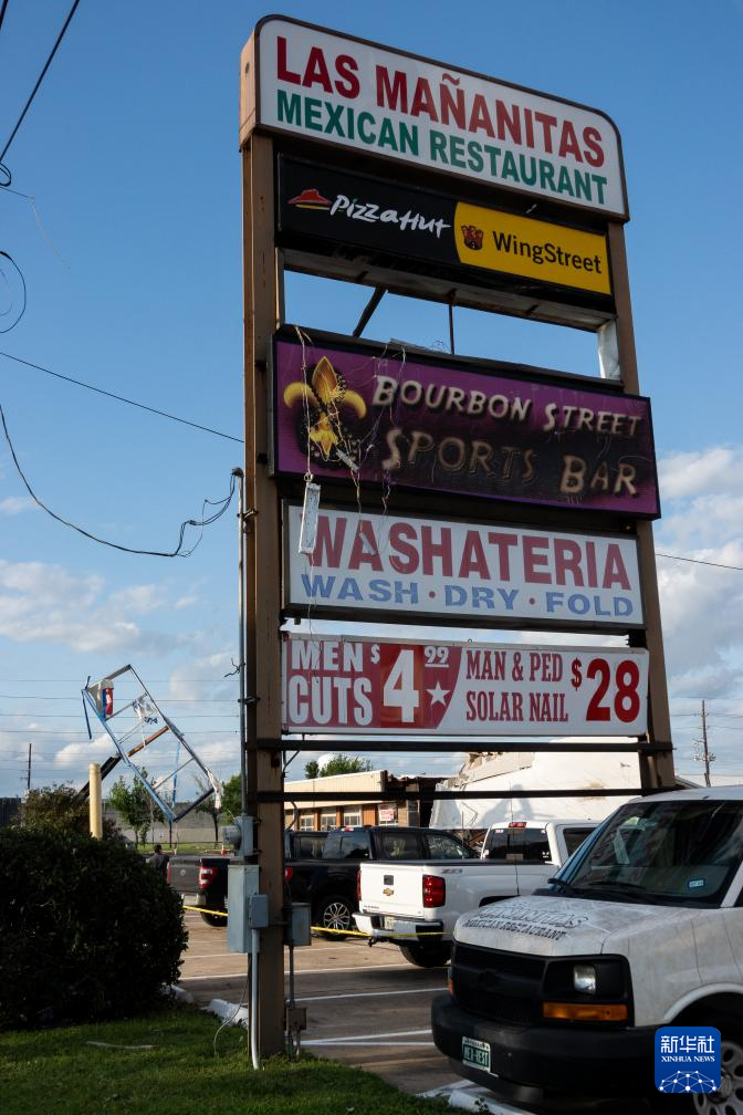 4月10日,在美国休斯敦附近的凯蒂,一座购物中心的广告牌遭龙卷风袭击后受损。