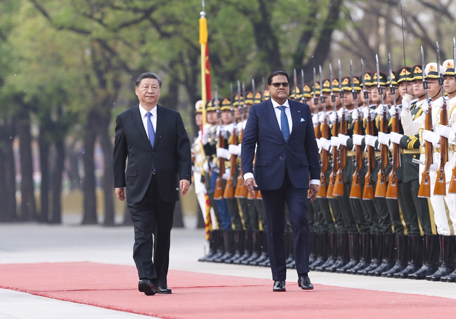 4月12日下午,国家主席习近平在北京人民大会堂同来华进行国事访问的苏里南总统单多吉举行会谈。这是会谈前,习近平在人民大会堂东门外广场为单多吉举行欢迎仪式。 新华社记者 翟健岚 摄