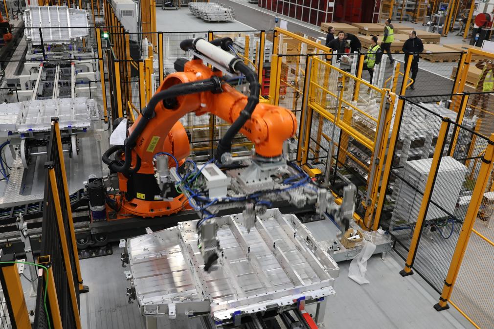 2月23日,在法国吕茨,搬运机器人在中国敏实集团与法国雷诺集团成立的合资公司的电池盒产线上工作。新华社记者张百慧摄