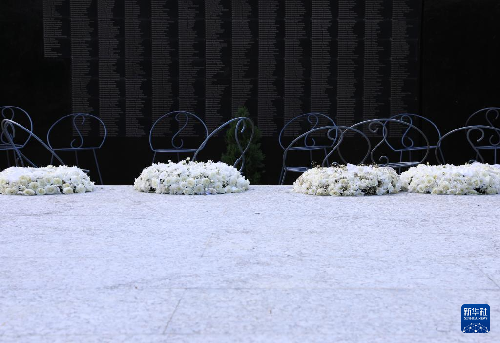 4月8日在卢旺达首都基加利拍摄的基加利大屠杀纪念馆墓地(下)与遇难者名单墙(上)。墓地里安葬着超过25万名大屠杀遇难者的遗体。