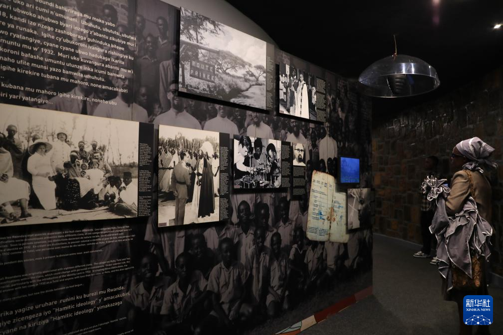4月8日,在卢旺达基加利的基加利大屠杀纪念馆展厅,一名女子观看记录殖民者强行划分卢旺达人“胡图族”或“图西族”种族身份的展览。