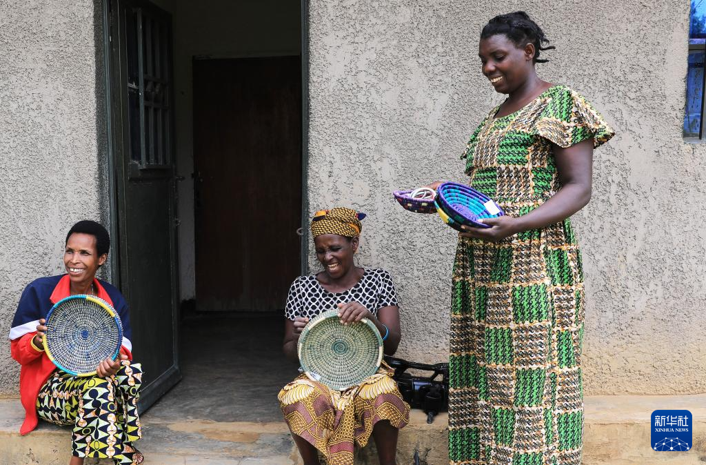 4月7日,在卢旺达东方省布格塞拉地区的姆比约团结和解村,大屠杀幸存者杰奎琳(左一)与村里的妇女展示合作社编织的小装饰品。