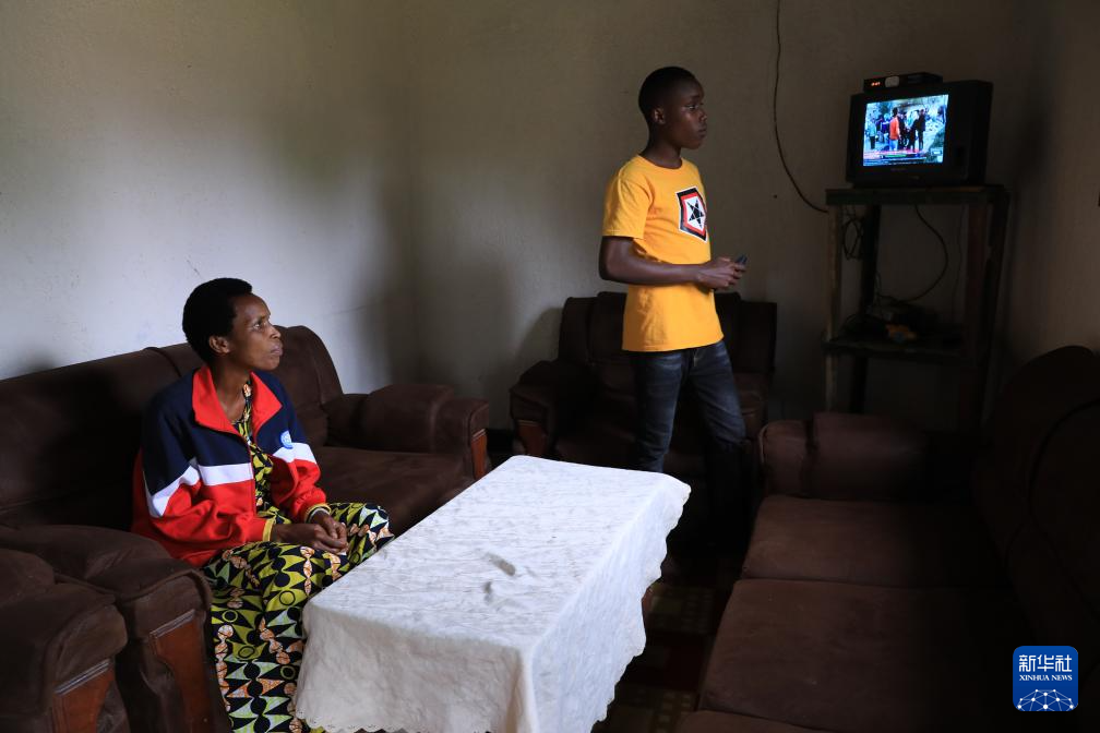 4月7日,在卢旺达东方省布格塞拉地区的姆比约团结和解村,大屠杀幸存者杰奎琳与儿子在家中看电视。