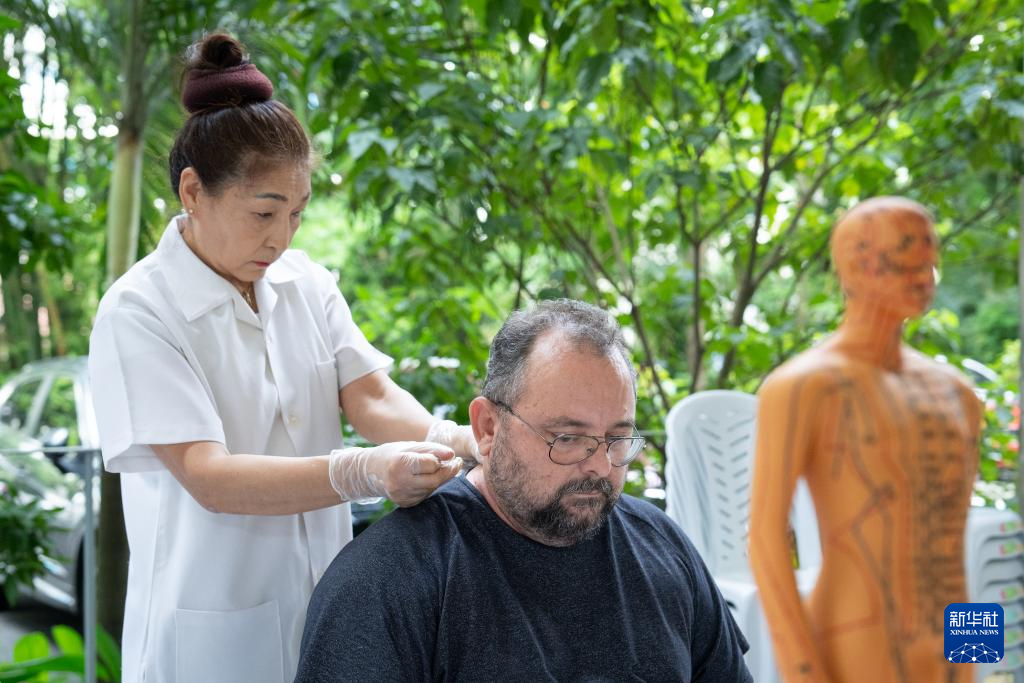 4月18日,在巴西里约热内卢举行的联合国中文日活动上,一名男子体验中医治疗。