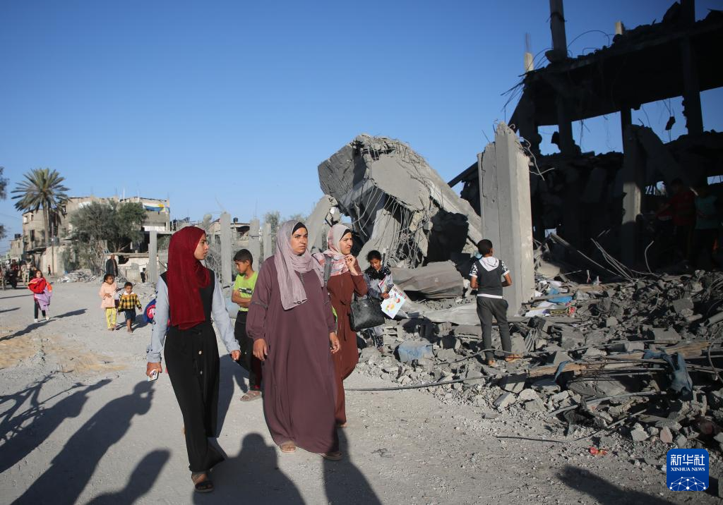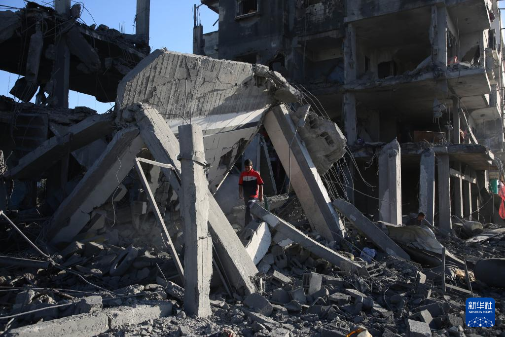 4月20日,在加沙地带南部城市拉法,巴勒斯坦人路过被以军空袭的建筑。