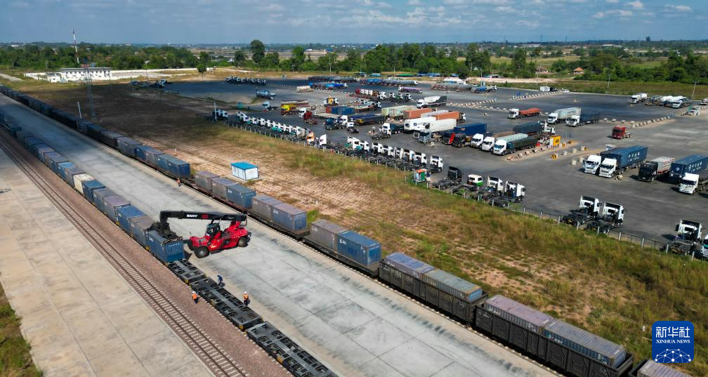 4月11日,在中老铁路老挝万象南换装场,工作人员组织货物换装作业。