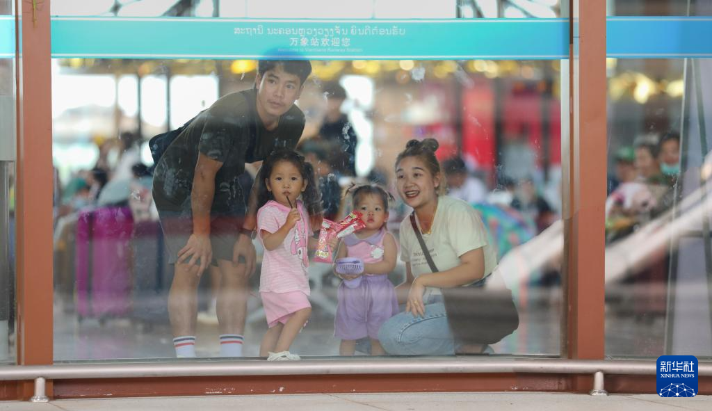 4月11日,在中老铁路老挝万象站候车室,旅客透过玻璃观看“澜沧号”动车组列车。
