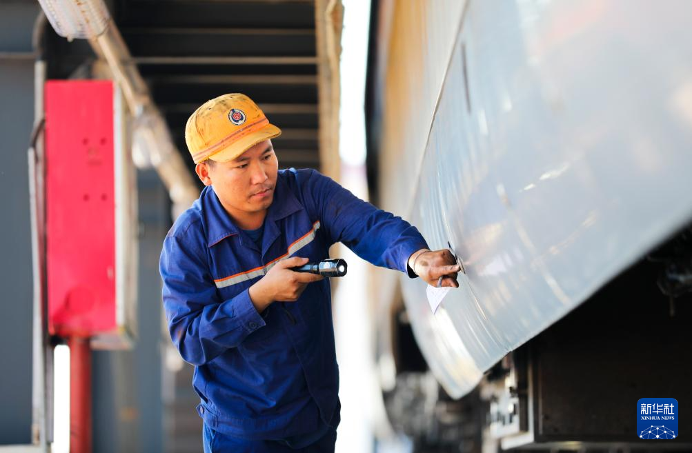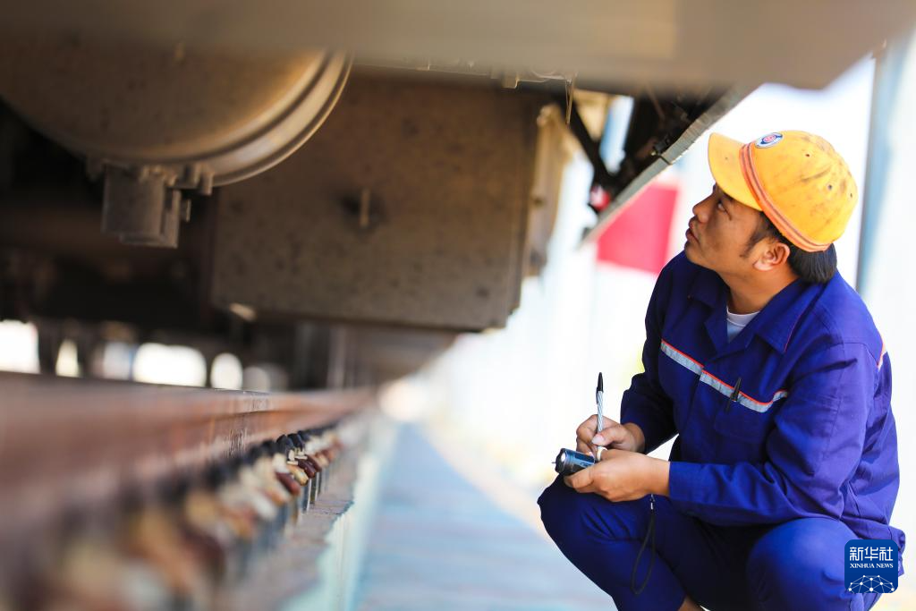 4月10日,在中老铁路老挝万象客整所,工作人员对“澜沧号”动车组列车进行检修作业。