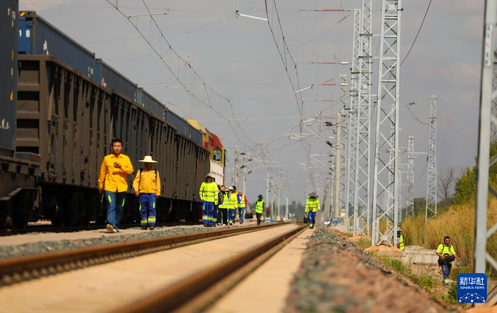 4月11日,在中老铁路老挝万象南站,铁路线路工人徒步检修铁路。