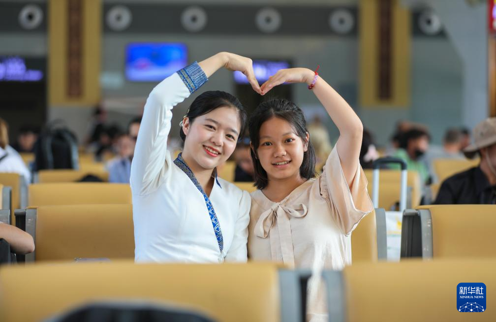 4月15日,在中老铁路老挝琅勃拉邦站,车站工作人员与旅客合影。