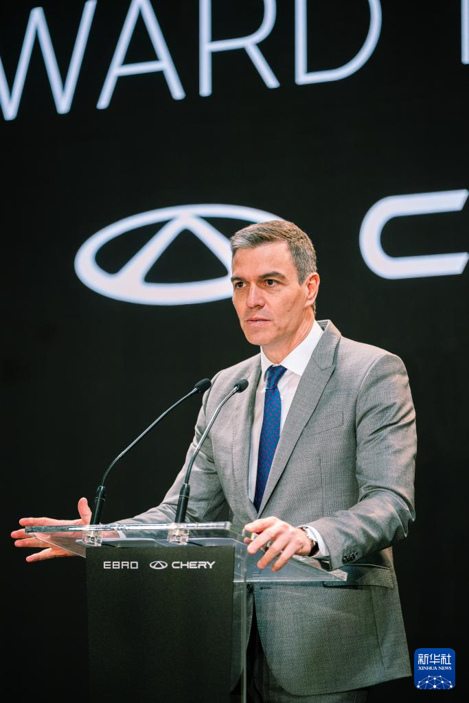 4月19日,在西班牙巴塞罗那自由贸易区,西班牙首相桑切斯出席中国奇瑞汽车公司与西班牙埃布罗公司电动汽车合作协议签字仪式时致辞。