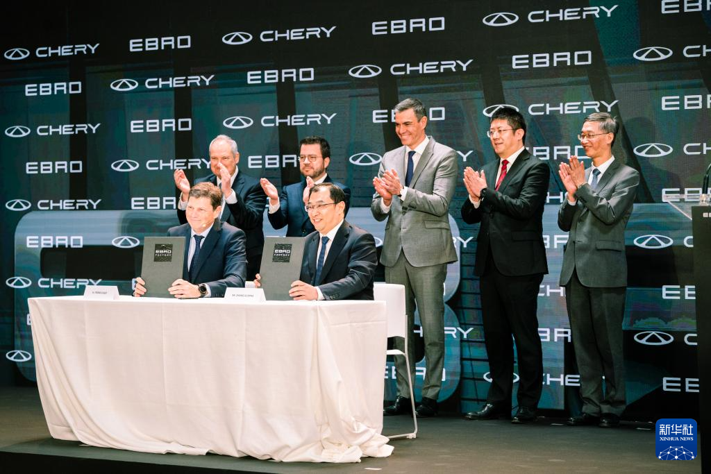 这是4月19日在西班牙巴塞罗那自由贸易区拍摄的中国奇瑞汽车公司与西班牙埃布罗公司电动汽车合作协议签字仪式现场。