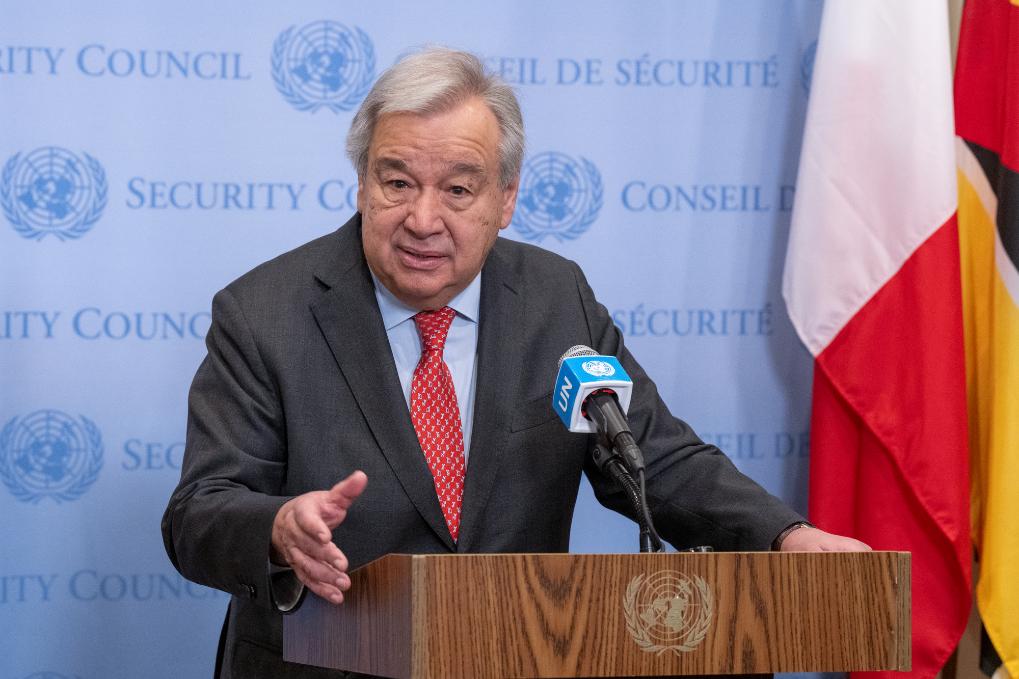 4月5日,在位于纽约的联合国总部,联合国秘书长古特雷斯举行记者见面会。新华社发(联合国供图/埃瑟金德尔·德贝贝摄)