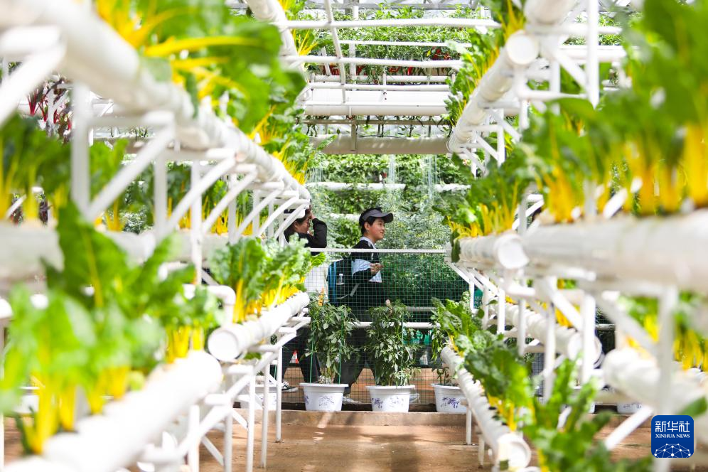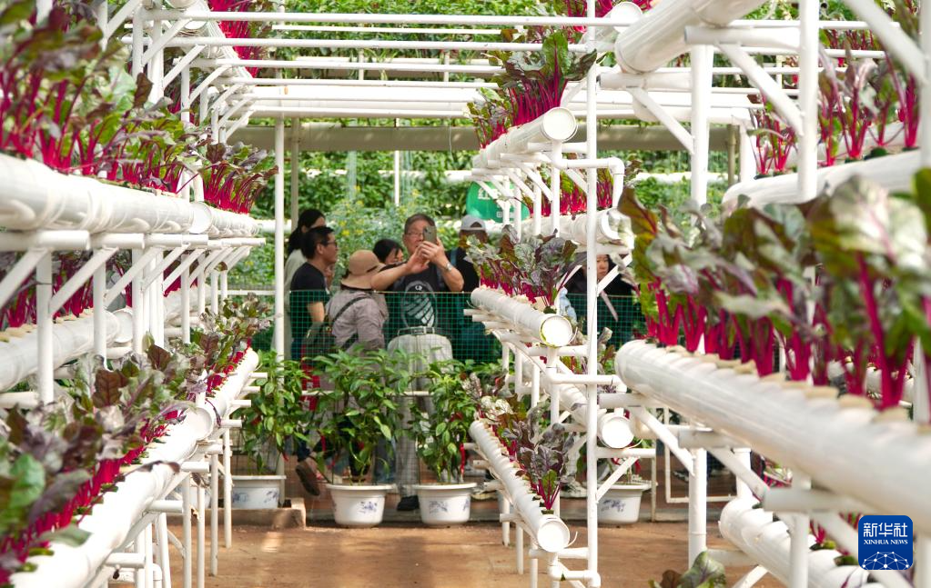 4月21日,参观者在第二十五届中国(寿光)国际蔬菜科技博览会上观看无土栽培温室。