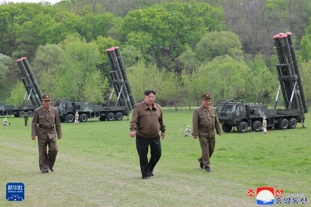 这张朝中社提供的照片显示的是4月22日,朝鲜劳动党总书记、国务委员长金正恩指导超大型火箭炮兵部队进行核反击模拟演习。