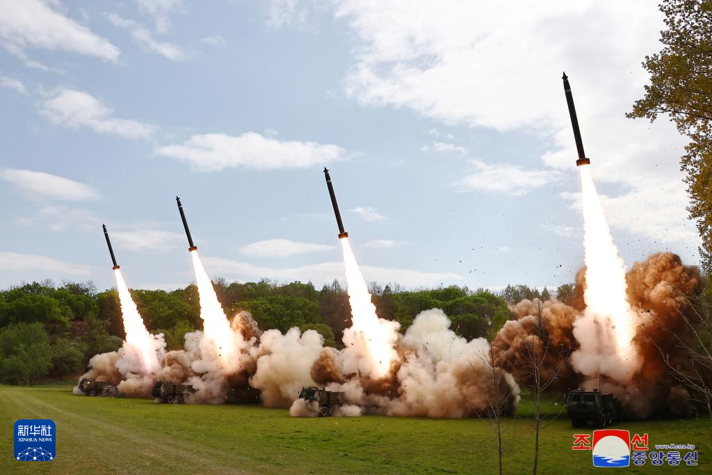 这张朝中社提供的照片显示的是4月22日拍摄的火箭炮齐射画面。