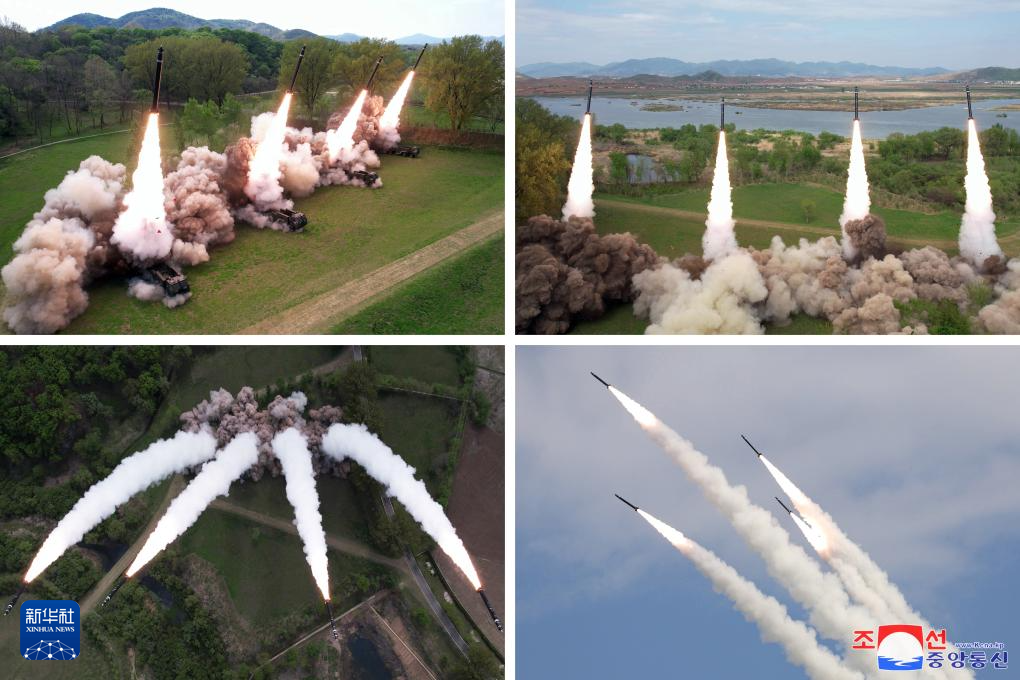 这张朝中社提供的拼版照片显示的是4月22日拍摄的火箭炮齐射画面。