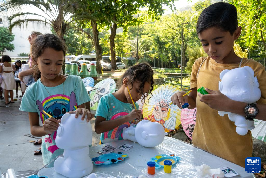 4月21日,在巴西里约热内卢,巴西儿童体验给熊猫玩偶上颜色。
