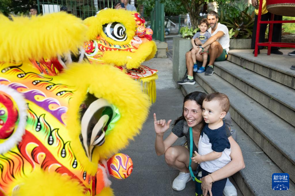 4月21日,在巴西里约热内卢,一名女子带着孩子观看舞狮表演。
