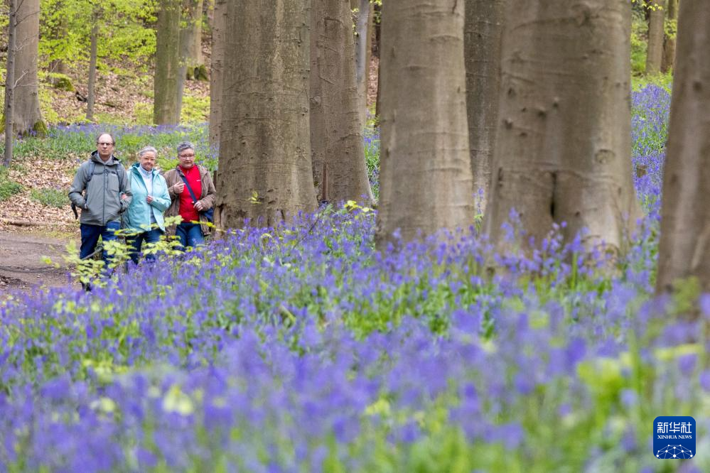 4月23日,游人在比利时布鲁塞尔附近的哈勒森林欣赏蓝铃花。