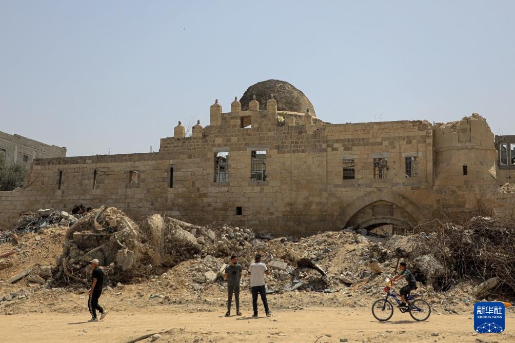 4月23日,在加沙地带南部城市汗尤尼斯,巴勒斯坦人路过因冲突遭到损毁的巴尔库克城堡。