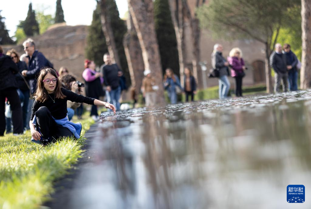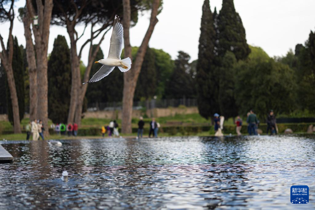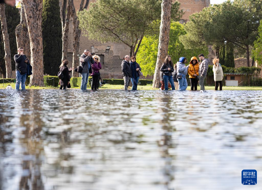 4月25日,游客在意大利罗马卡拉卡拉浴场“镜子”水池休闲。