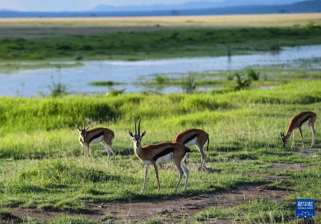 4月27日,在肯尼亚卡贾多县安博塞利国家公园,一群羚羊在觅食。