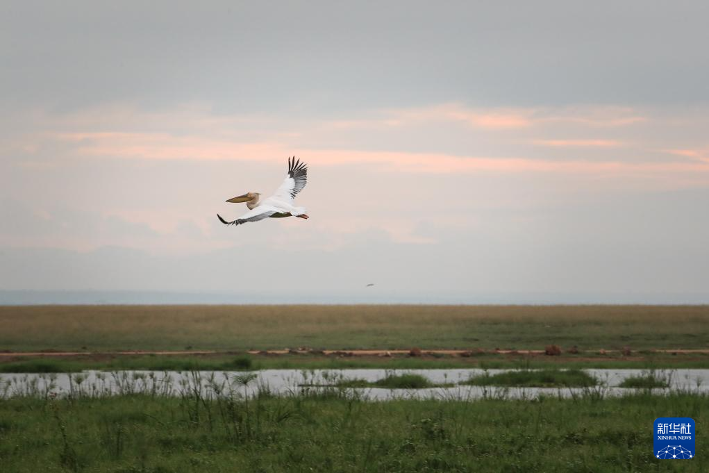 4月28日,在肯尼亚卡贾多县,鹈鹕在安博塞利国家公园里飞翔。