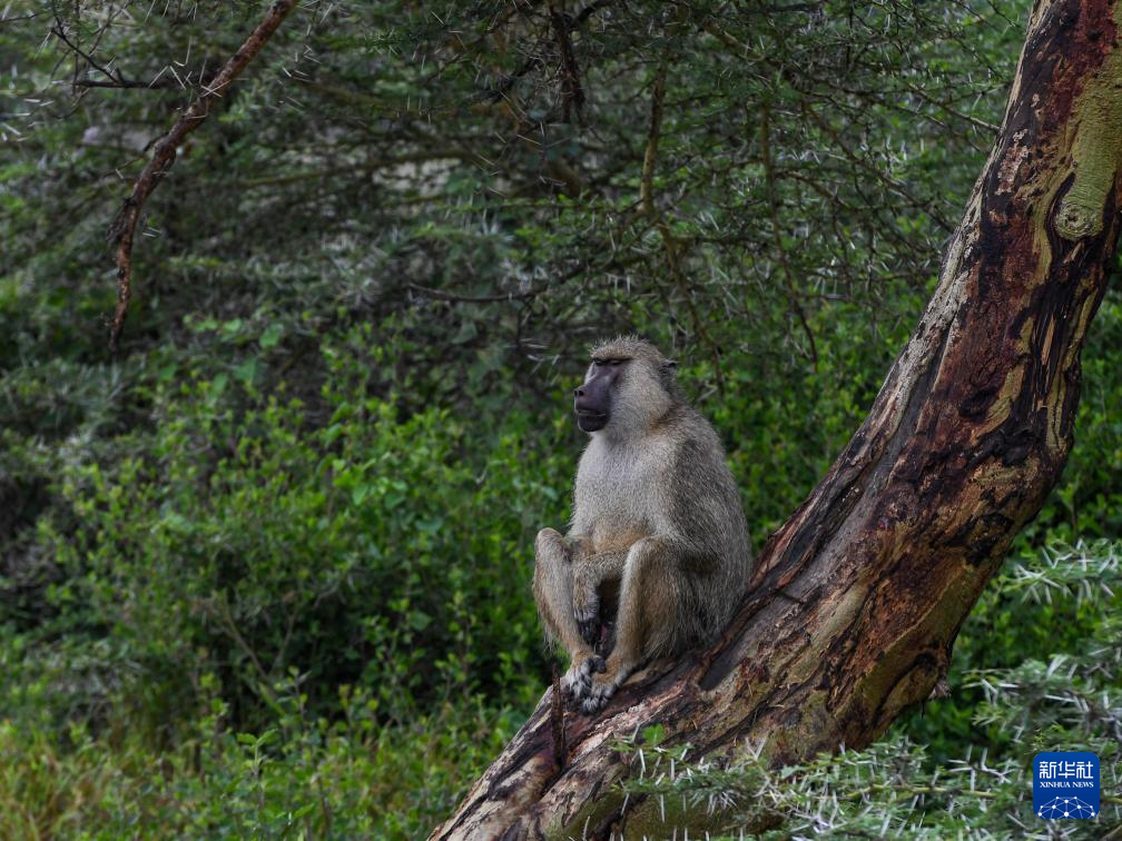 4月28日,在肯尼亚卡贾多县,长尾黑颚猴在安博塞利国家公园里活动。